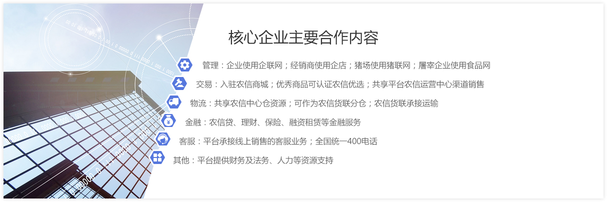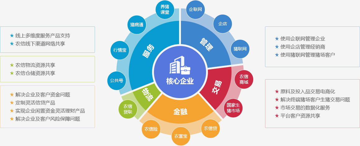 核心企业是指行业内的龙头企业,在cq9电子官网入口商城注册的品牌厂商,并与cq9电子官网入口全面合作的会员企业,依托cq9电子官网入口平台生态圈体系,在管理、交易、金融、物流、服务各方面展开合作。通过企联网管理企业,企店管理经销商,猪联网管理猪场,实现管理效率提升的同时,依托cq9电子官网入口平台推动企业整体数字化转型,包括管理数据化、交易电商化,金融科技化,获客线上化,同时带动其产业链上下游用户进行互联网化产业升级。